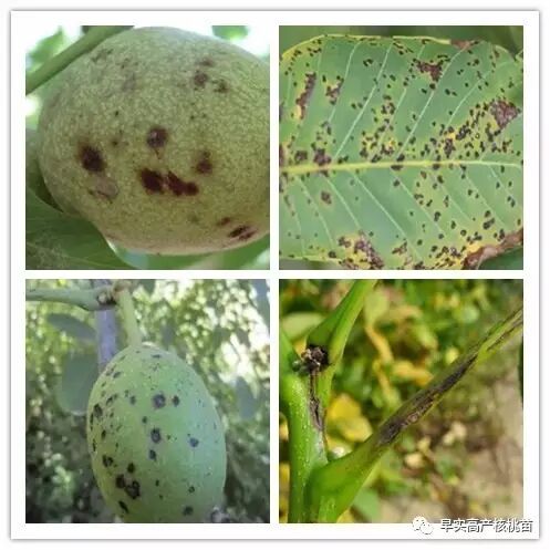 一直以来核桃苗行业培育的嫁接苗都是用普通的核桃做砧木,然后再嫁接上早实品种的接穗。人们一直关注的是自己购买的是不是嫁接苗,但是从来没注意过嫁接的砧木的品种。因为苗子栽植后主要是靠根,先扎根,在吸收养分才能长叶子,长果子,一旦根部发生病害,面临的就是苗子整株死亡,这也就是为什么普遍的苗子一到每年的5-7月份高温多雨季时就会出现果实烂,树叶发黄长黑斑的情况,也就是砧木的抗病弱,易染菌病。如下图: